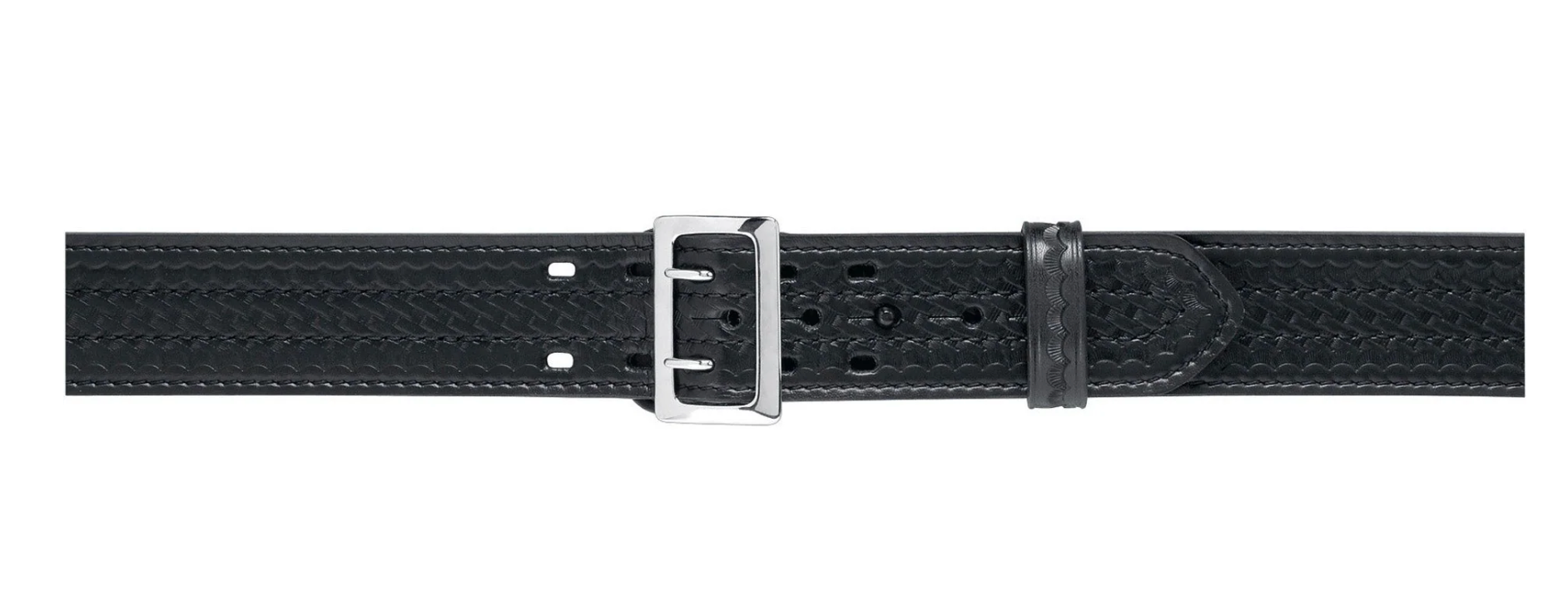 This Model 87 Sam Browne duty belt features SafariLaminate construction with suede lining. This four-stitch design has the Sam Browne-style double tongued buckle and center belt stud to fasten it firmly around the waist. 2.25 (58mm) width. Black.